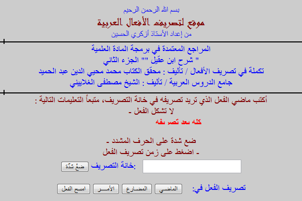 «موقع لتصریف الأفعال العربیة» پایگاهی اینترنتی است که توسّط استاد أزکری الحسین تهیه شده و با تکیه بر معلومات صرفی شرح ابن عقیل، تکملة فی تصریف الأفعال و جامع الدروس العربیة با ارائه ماده فعل توسط کاربر به صرف صیغه های متنوّع هر فعل می پردازد.