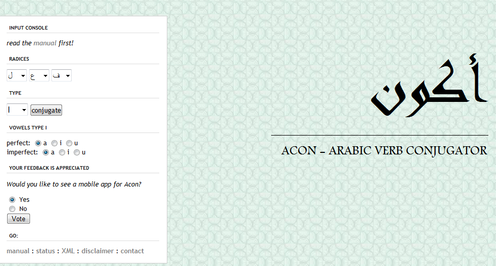 سایت «أکون» (Acon - Arabic Verb Conjugator) سایتی است که برای تصریف افعال زبان عربی طراحی شده است. با وارد کردن یک فعل ماضی می توانید بقیه تصذیفات آن را دریافت کنید.